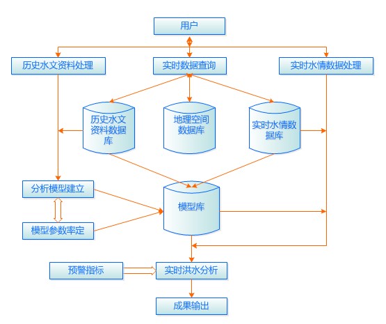 山洪灾害风险分析系统主要是为了应对小流域山洪灾害的突发性和难以预测性,辅助各级防汛指挥人员进行山洪灾害监测、分析、预警,从而更加有效地防治灾害、降低损失,为防汛决策提供依据。针对防治区所有预警断面建立洪水实时预警模型,并根据每个断面的物理特性,对洪水实时预警模型进行参数率定,最终建立适合于每个预警断面的洪水分析方案。系统根据已经建立的洪水分析方案和实时雨水情数据进行实时计算,再结合相关的雨量预警指标成果、水位预警指标成果、流量关系曲线成果等,最终给出所有预警断面的预警信息。